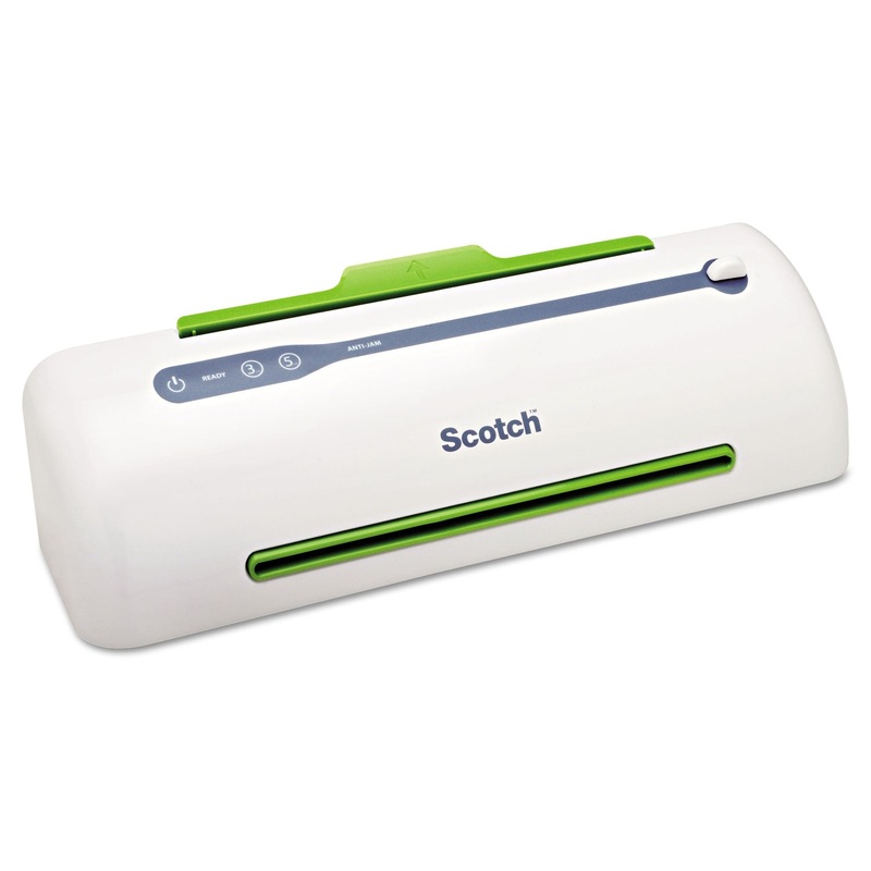 Ideal for small or home offices that need hassle-free, professional-quality laminating. Laminates items up to 9" and comes with patented Never Jam technology that prevents pouch jams and damage to items. Warms up in five minutes and laminates at 15" per mi