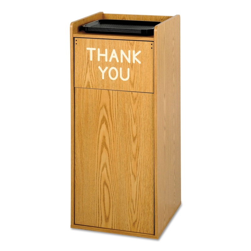 Constructed of high-grade 5/8″ compressed wood with melamine finish. Push door can be hung to display the words THANK YOU, or reversed for a neutral look. Recessed bottom with poly floor glides to protect floors. Accepts 36-Gallon Rigid Plastic Liner (SAF9669), sold separately.