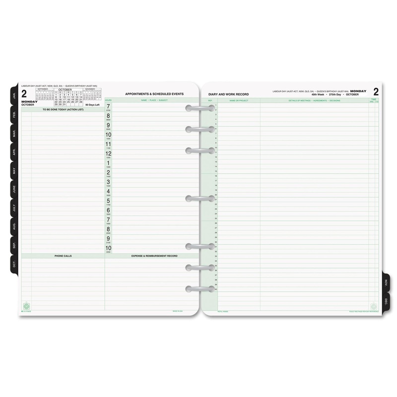 Made for the busiest schedules. One day per two-page spread; tabbed monthly overviews. Left page for To Be Done, Appointments and Scheduled Events; right page for Diary and Work Record with numbered lines. Reference pages and page locator. Space for Phone Calls and Expense/Reimbursement Record. Printed on quality, recycled paper containing post-consumer recycled material.