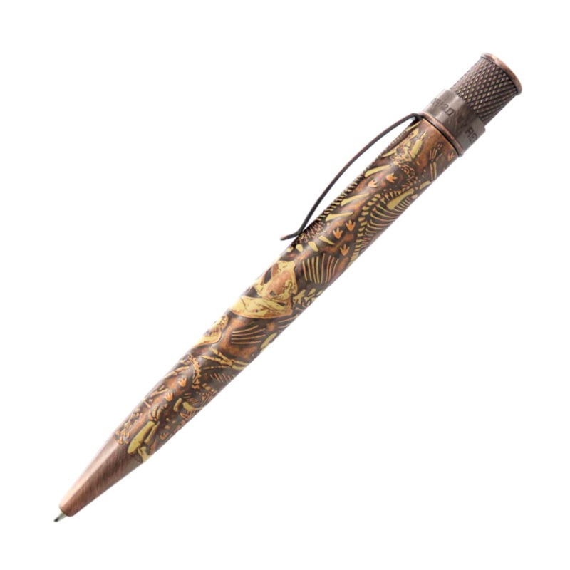 As part of the Smithsonian Series, The Retro 51 Dino Fossil Rollerball has a metal barrel with acid etched plated stone-washed copper with a textual feel that allows you feel the design elements. The top ring includes the Smithsonian name and the logo on t