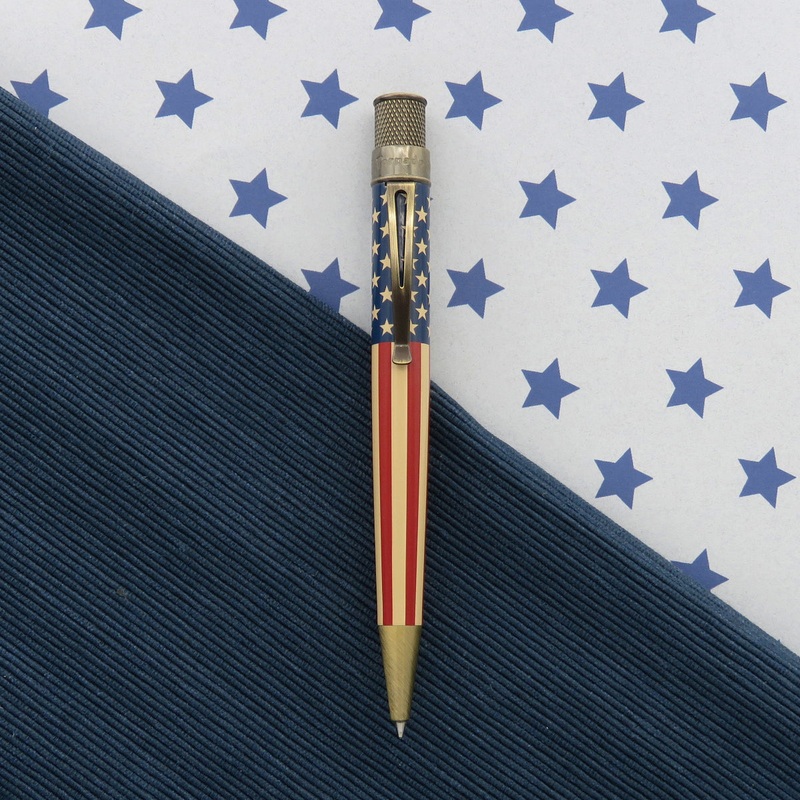 The design features the classic red, white, and blue stars and stripes in a weathered, vintage tone. Antique brass accents enhance the heritage-inspired look, while the top disc proudly displays Estd. USA 1776, reinforcing its historical roots. Each pen is packaged in a matching graphic tube, making it display-worthy for collectors and gift-givers alike.