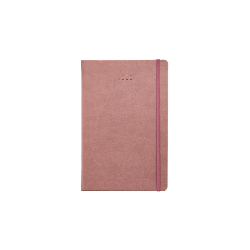 This oversized A5 notebook has a pink leatherette hard cover, elastic closure, and elegant round corners. The corners are microperforated so you can tear off completed weeks, making it easy to find where you left off.