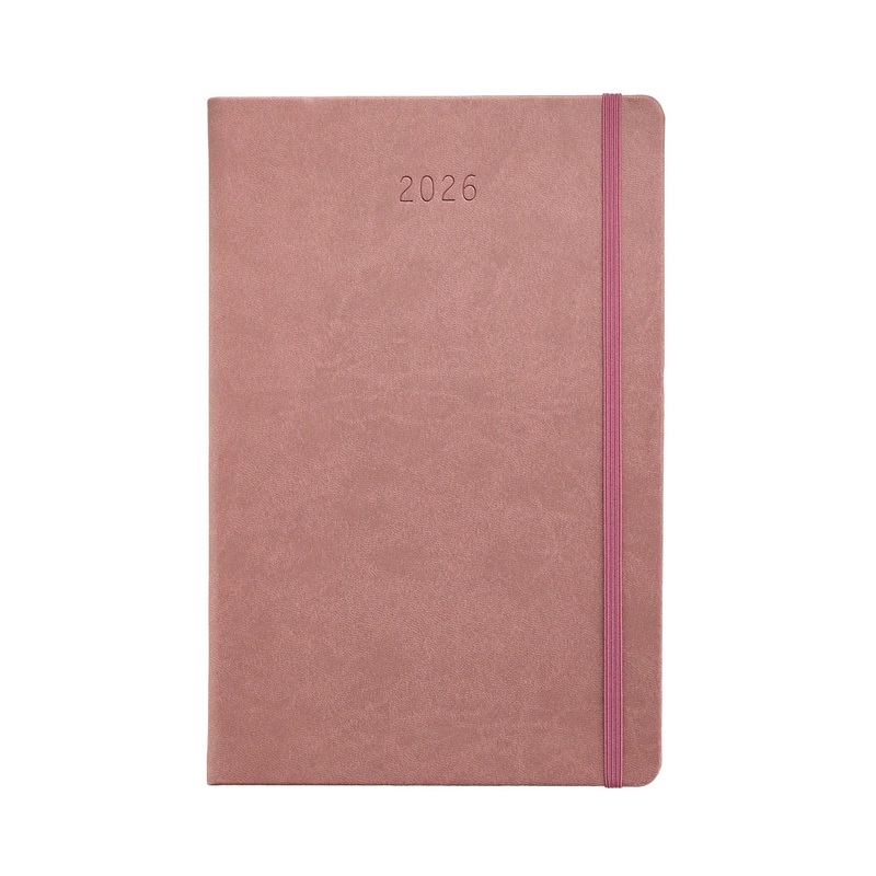 This oversized A5 notebook has a pink leatherette hard cover, elastic closure, and elegant round corners. The corners are microperforated so you can tear off completed weeks, making it easy to find where you left off.