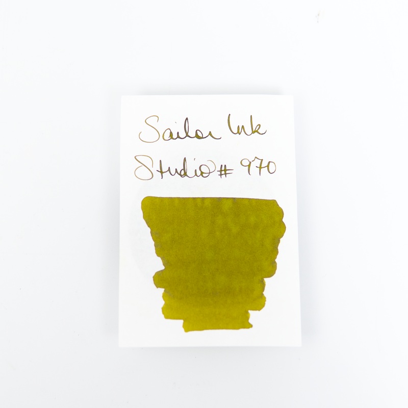 20ml square glass bottle of Sailor Ink Studio 970 dark yellow fountain pen ink.A set of small stickers with the name of the ink are included for labeling your ink converter, so you can always remember what ink you're using.This smooth-flowing water-based d