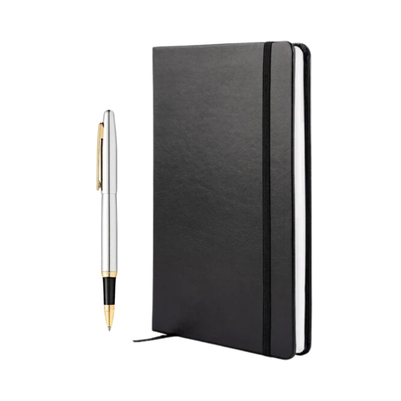 Accompanying the pen is a premium A5 notebook, featuring 160 ruled, fountain pen-friendly pages within a durable black leatherette hardbound cover. This set is ideal for professionals, students, or anyone who values timeless elegance in their writing tools.