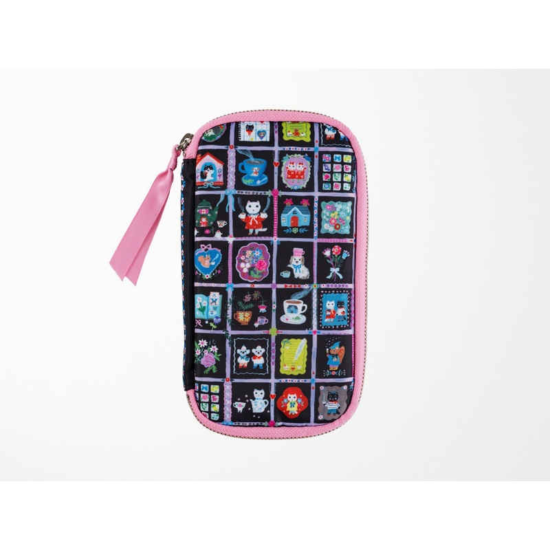 A pen case-style pouch that opens flat with a zipper, letting you see all the contents at a glance. With illustrations by Yumi Kitagishi, this design is themed around a moment to relax and unwind. Colorful illustrations are scattered across a black background, and the pink gusset and zipper pull add an extra pop of color.