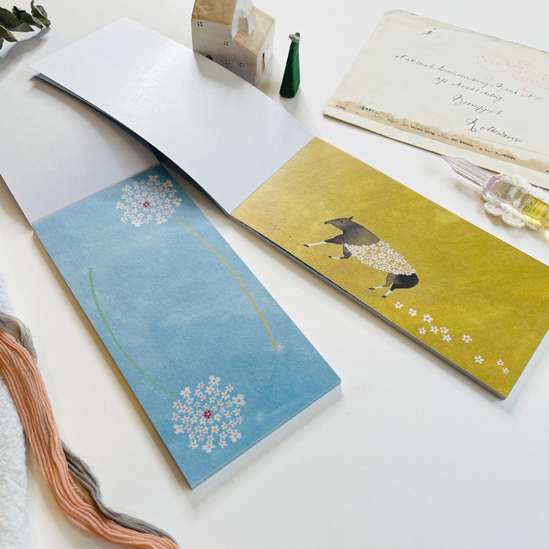 Fountain pen friendly.4 different illustrations, 5 sheets each. Dimensions: 6.5"x 3.2"Made in Japan