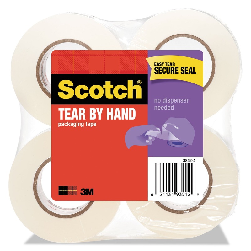 Scotch Tear-By-Hand Mailing Packaging Tape easily tears by hand, in a straight line. No scissors or dispenser needed.