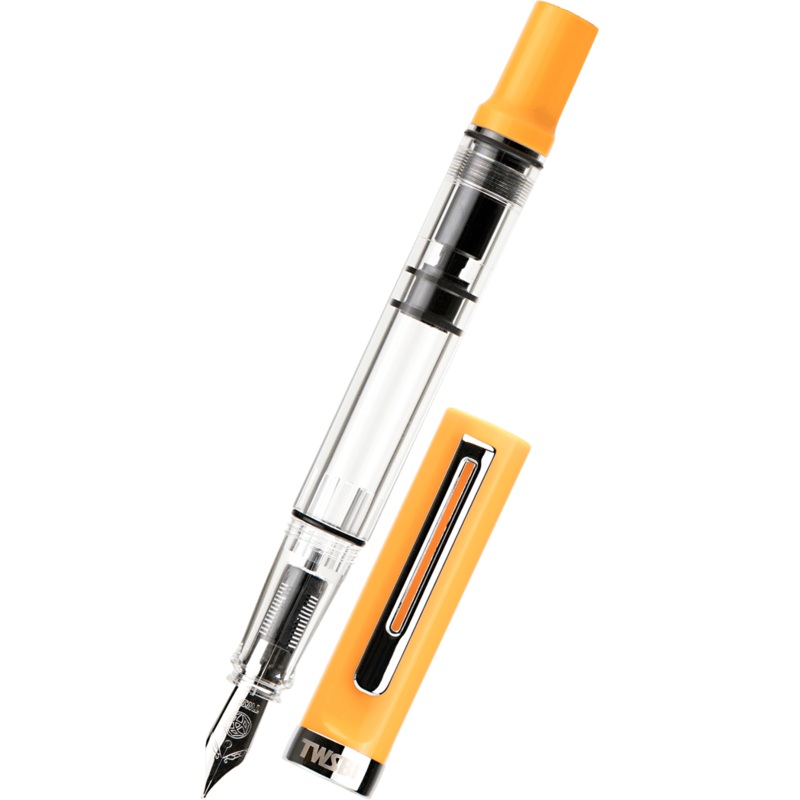 The TWSBI ECO-T fountain pen boasts an incredible value with its piston filling system and affordable price. This special edition features a crystal clear acrylic barrel so you can see your ink level, and a solid saffron orange-yellow colored cap and pisto