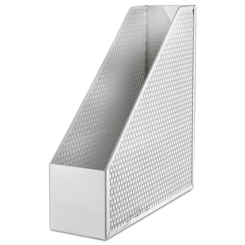 Strong, professional grade punched metal with decorative urban style slotted pattern. High quality satin finish complements any dcor. Features protective feet to prevent wear and scratches on the desktop surface. Reinforced rounded edges provide durability and attractive detailing. Securely displays and organizes magazines, catalogs, files and literature on your desktop, keeping them within reach. The generous front panel provides four-sided base protection and structure to the contents so they wont fall out.